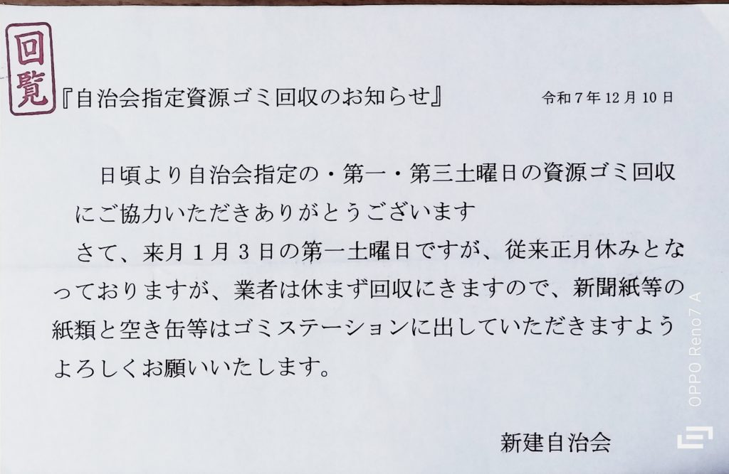 2025年12月22日 / 最終更新日時 : 2025年12月22日 masumoto 自治会のお知らせ 新建資源ゴミ回収日と第四公園上街灯新設のお知らせ FacebookBluesky コメントを残す コメントをキャンセルメールアドレスが公開されることはありません。 ※ が付いている欄は必須項目ですコメント ※ 名前 ※ メール ※ サイト 次回のコメントで使用するためブラウザーに自分の名前、メールアドレス、サイトを保存する。 上に表示された文字を入力してください。